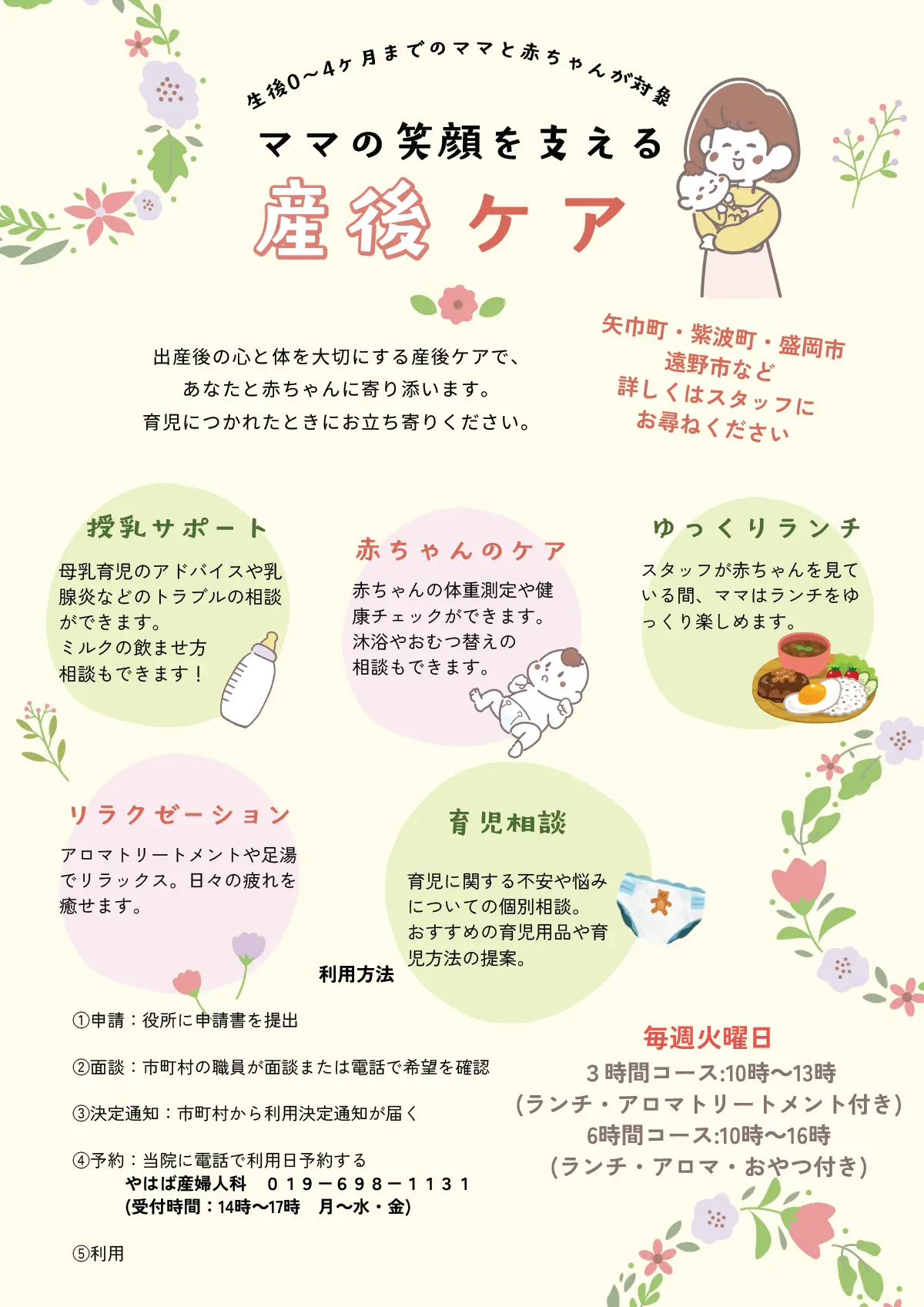 出産後、安心して子育てが出来ますようデイサービス型の産後ケア(当院にきていただく日帰りのケア)を実施しています。ご希望の方はお電話にてご予約ください。